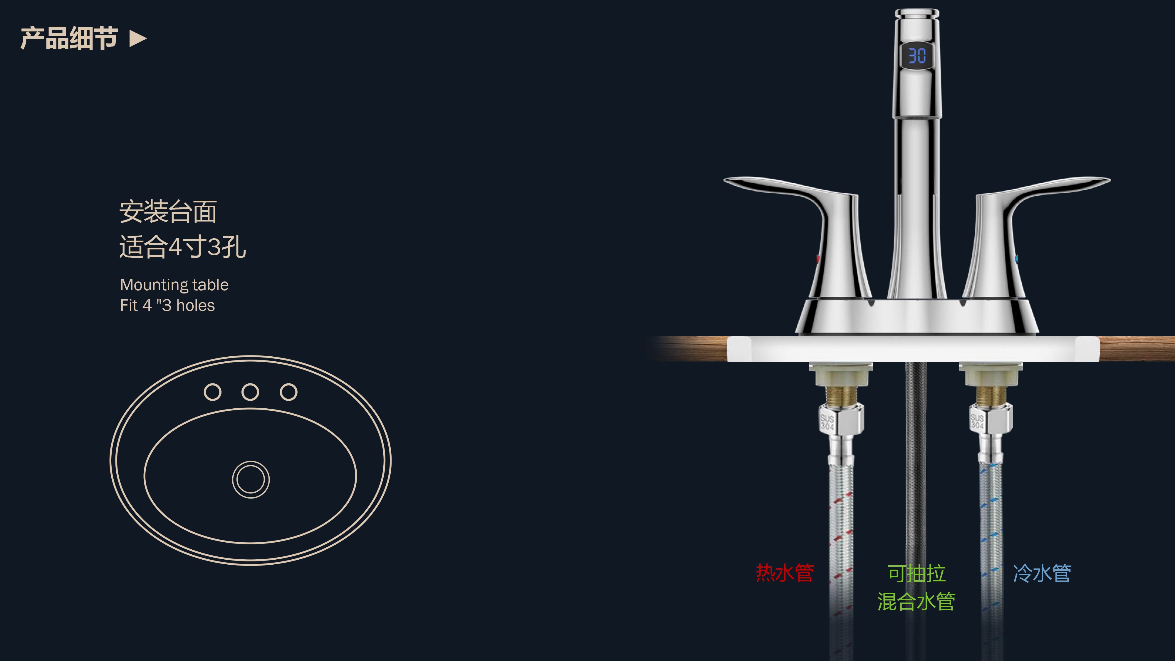 即時顯示溫度,安全防燙;日常洗頭利器,抽拉出水輕松洗;按壓切換兩功能水花;適合4寸3孔安裝臺面